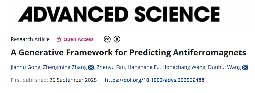 近日,杭州电子科技大学微电子研究院张正明副教授、王敦辉教授课题组在基于深度生成模型的反铁磁体设计中取得新进展,研究成果以“A generative framework for predicting antiferromagnets”为题在《Advanced Science》上在线发表。