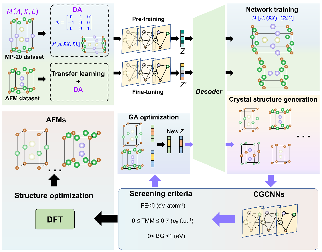 结构生成器(CDVAE-DA):一种晶体扩散变分自编码器,专为生成成分合理、结构稳定的晶体结构而设计。通过数据增强 和迁移学习,它学会了反铁磁材料的结构特征,生成成分的有效率高达90.68%。
